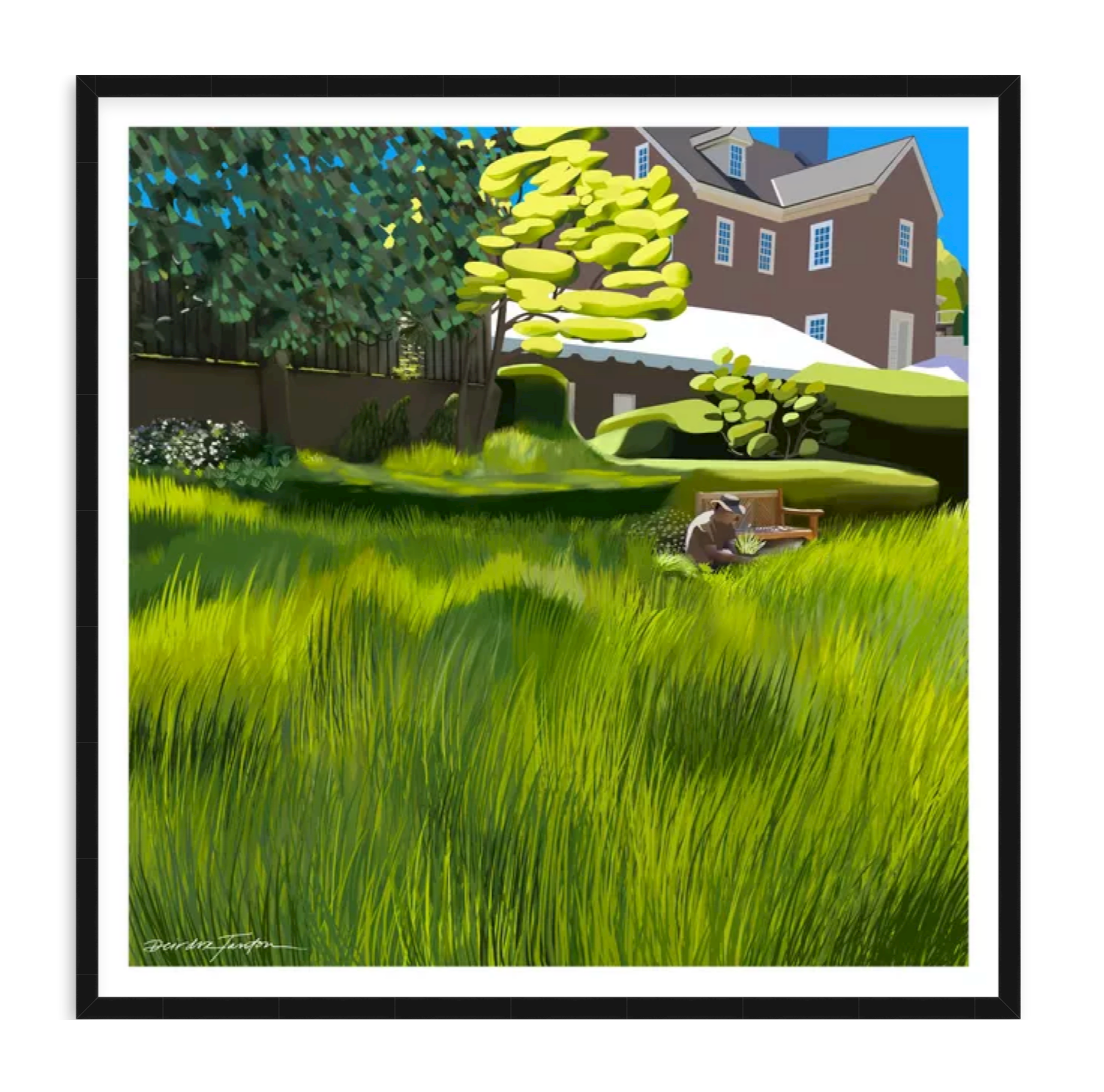In the tucked away garden behind Paca House, the garden keeper wears a straw hat during the Summer heat. Print of digital painting: archival, acid-free, lustre paper, premium inks, framed in a matt black wood frame.